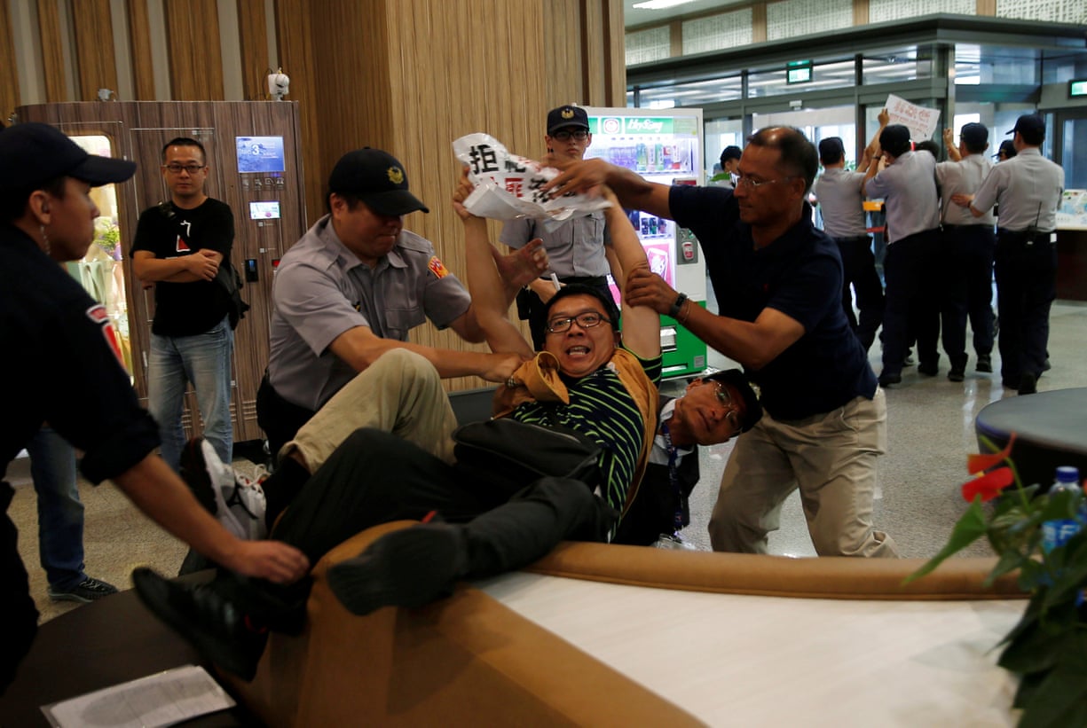 Anti-China demonstrators are stopped by police as a member of Shanghai’s Communist party arrives in Taiwan for a forum.