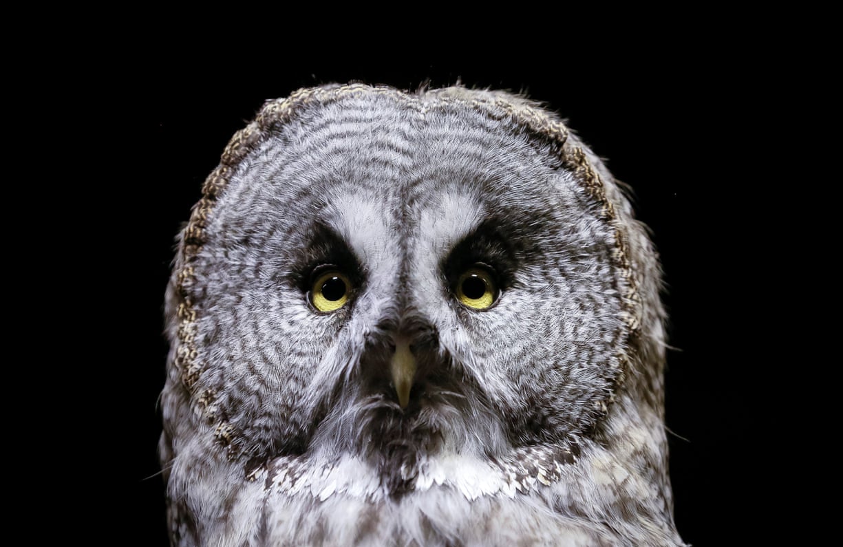 A great grey owl sits inside its cage at the Royev Ruchey zoo in a suburb of the Siberian city