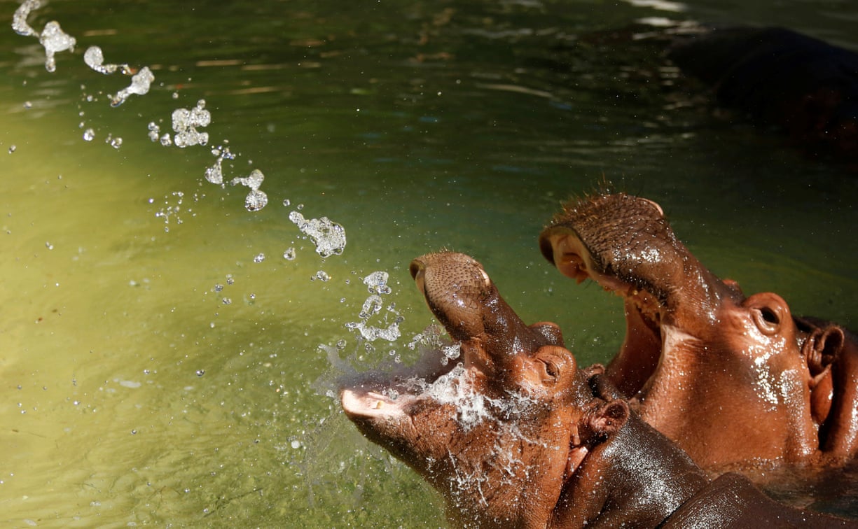 Big gulp: hippopotamuses reach for water sprayed in their enclosure at the Los Angeles Zoo