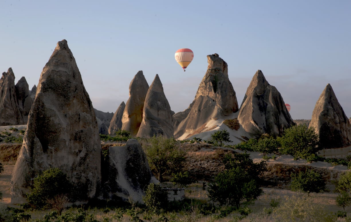 A hot air balloon flies over volcanic rock formations in Cappadocia, central Anatolia
