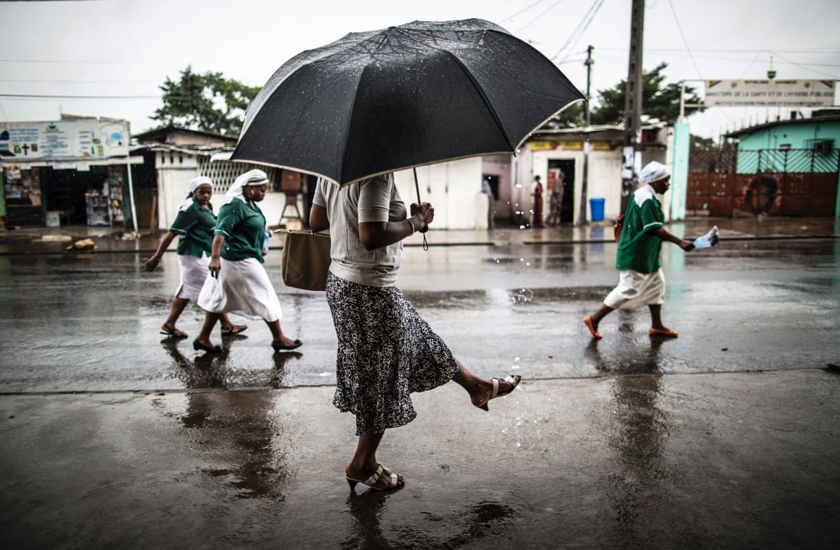 A woman cleans her foot with water streaming from a pipe as Catholic nuns leave St Michel church after Sunday’s service