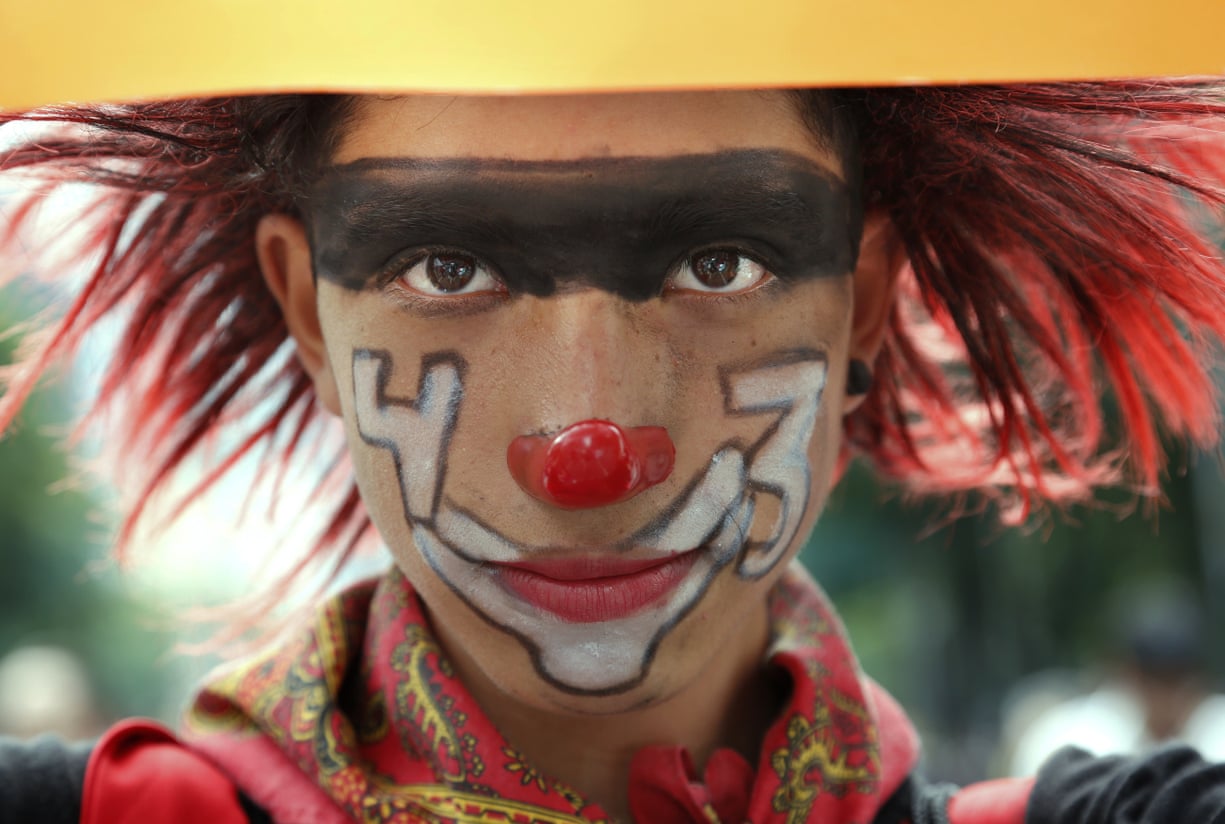 A protester dressed as a clown, with the number 43 painted on her face, attends a rally marking the disappearance of 43 students from a school in Ayotzinapa in 2014
