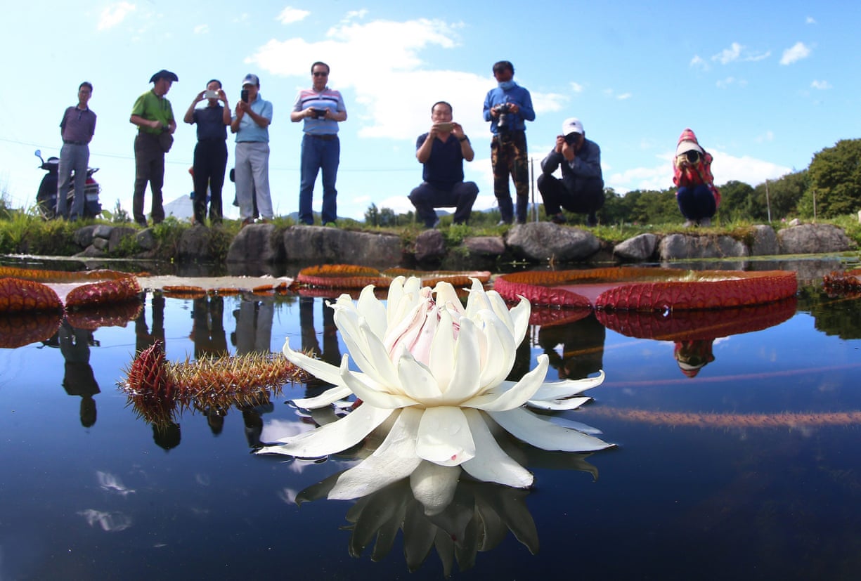 Tourists take pictures of a Victoria lotus flower in full bloom