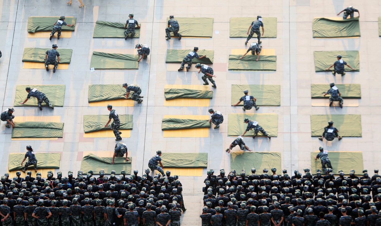 University students participate in a quilt-folding competition as part of their military training at the start of a new semester.