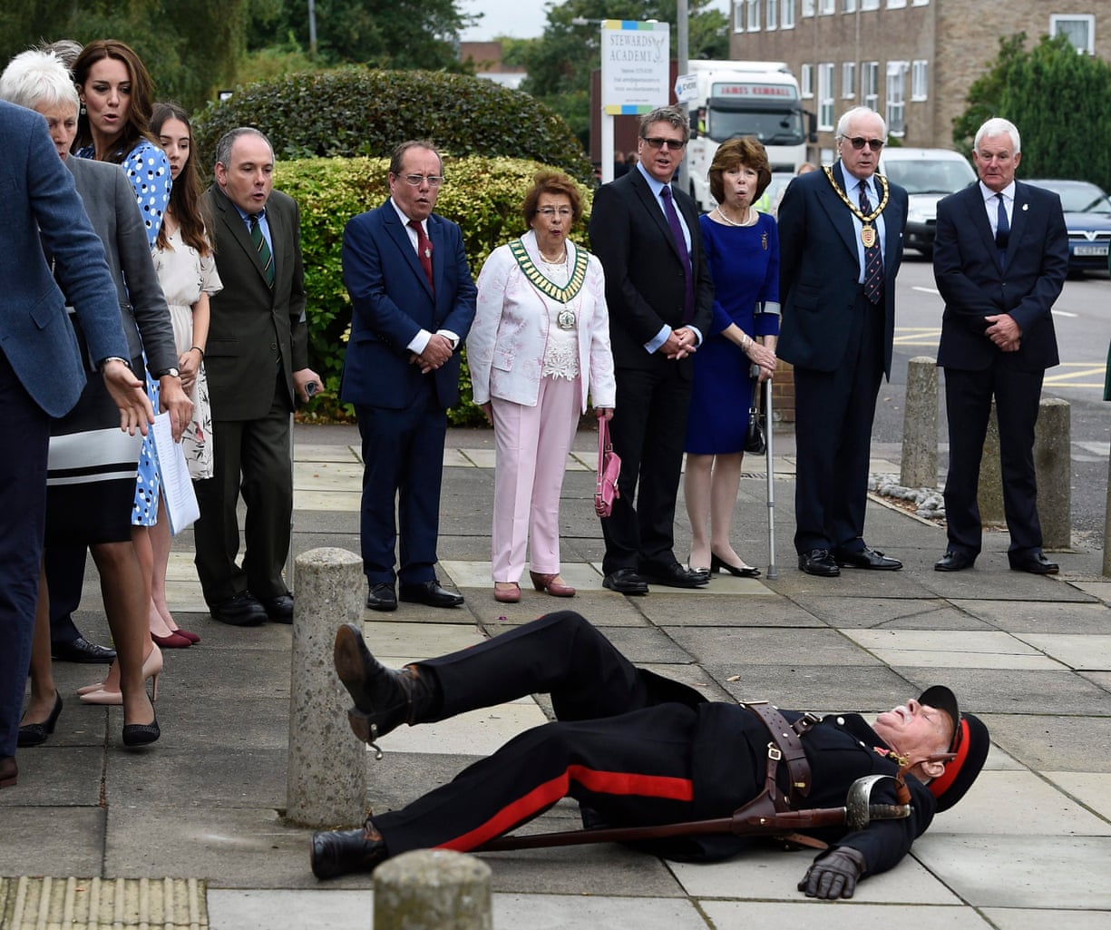 The Duchess of Cambridge, second from left, and others react after Jonathan Douglas-Hughes, vice-lord-lieutenant of Essex, tripped over a concrete bollard