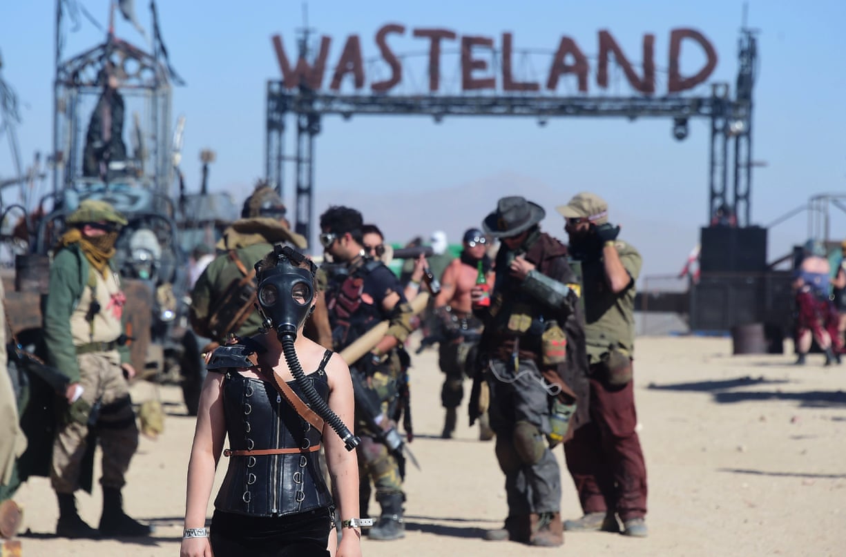 Festivalgoers attend the first day of the post-apocalyptic Wasteland Weekend in the high desert community of California City in the Mojave desert