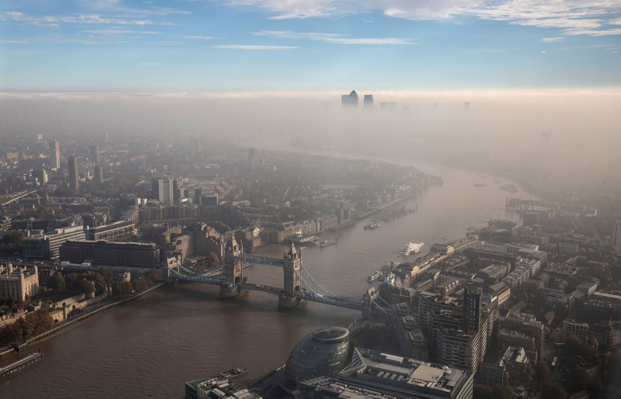 A view from the Shard showing Tower Bridge and Canary Wharf shrouded in fog this morning