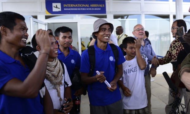 The sailors, from Vietnam, Taiwan, Cambodia, Indonesia, China and the Philippines, smile as they arrive at Nairobi airport. Photograph: STR/AP