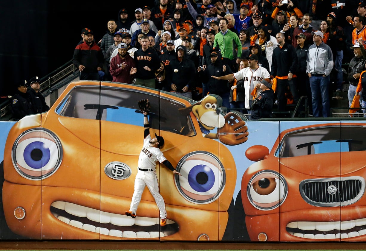 San Francisco Giants left fielder Gregor Blanco is unable to catch a two-run home run ball