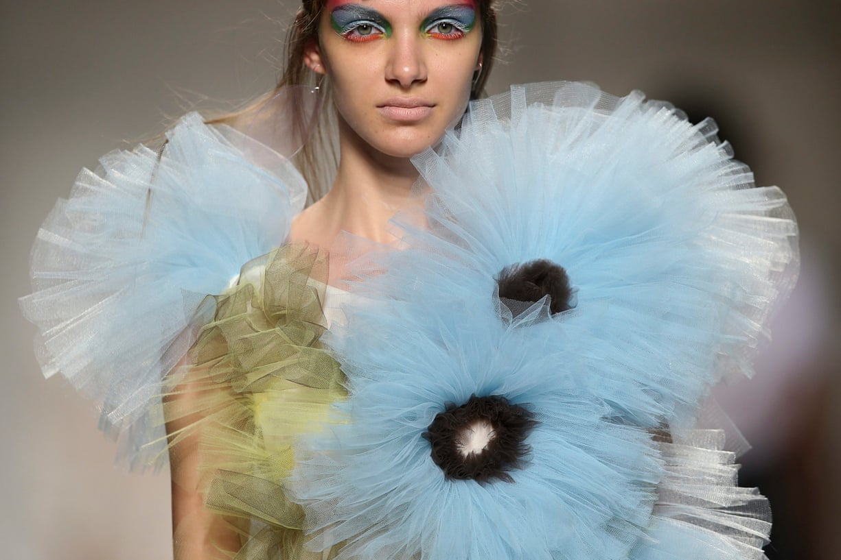 A model presents a creation by the Portuguese designer Dino Alves at Lisbon fashion week