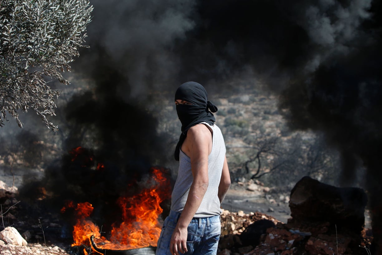 A Palestinian protester stands in front of burning tyres during clashes with Israeli security forces