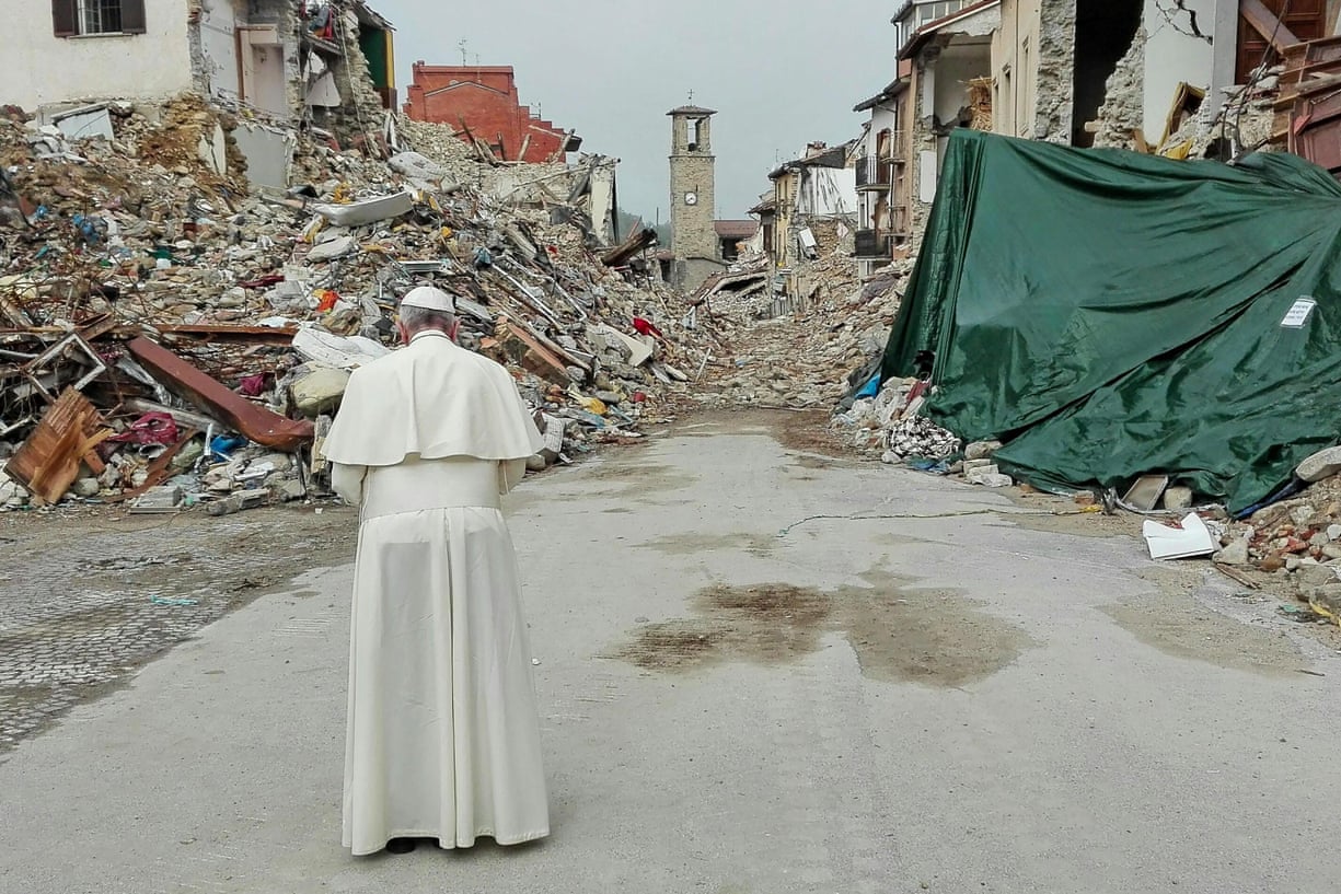 Pope Francis during a visit in Amatrice, the small Italian mountain town that bore the brunt of the August 24 earthquake in Italy. Photo Osservatore Romano/AFP/Getty