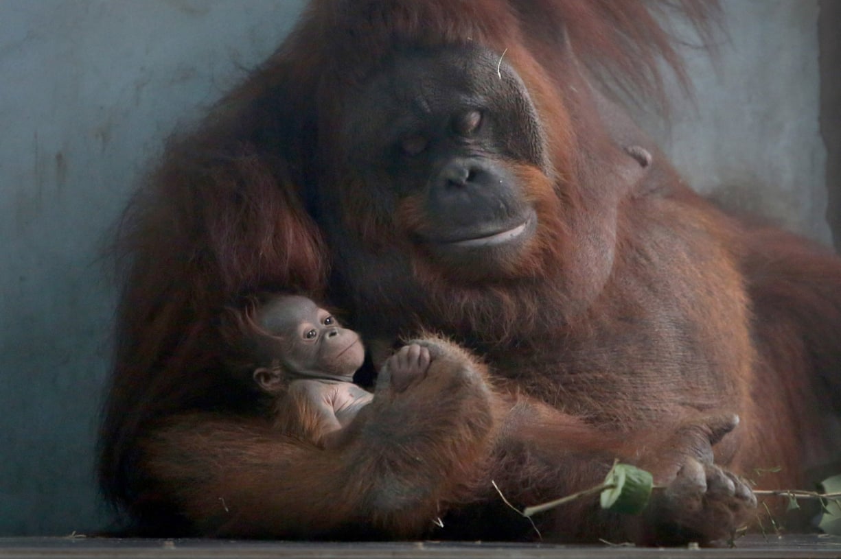 Orangutan Fei Fei holds a male offspring in her arms at Shanghai zoo. Fei Fei gave birth in the first successful reproduction of an orangutan at the zoo