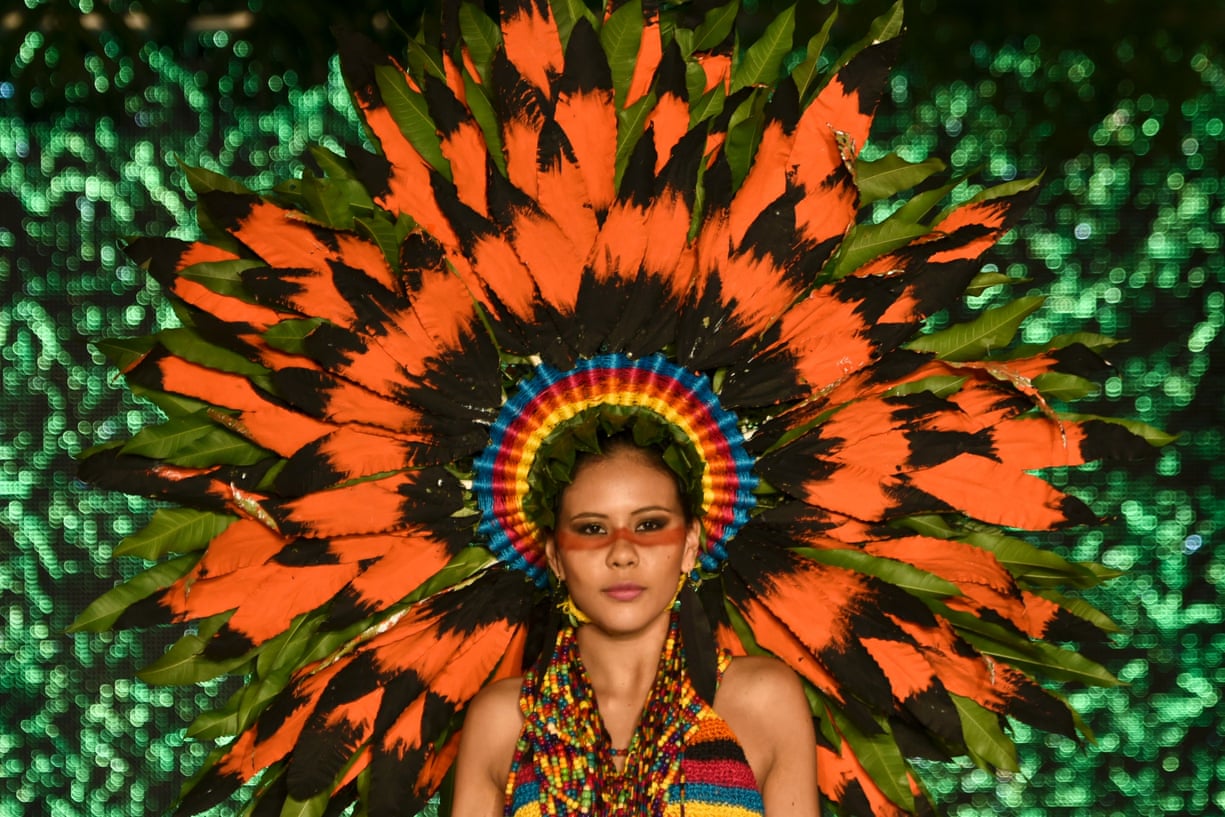 A model presents a creation by the Colombian designer Eduard Zapata made with organic elements during the BioFashion Show