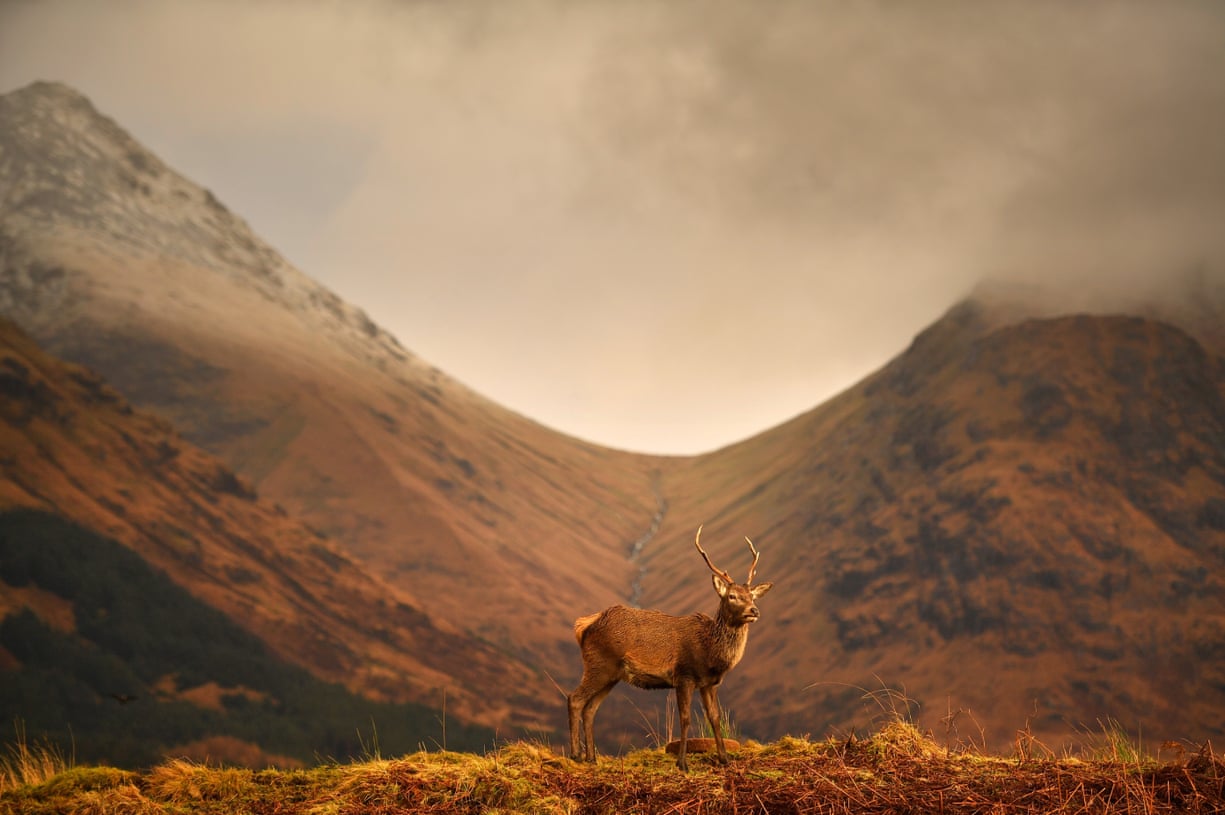 Scottish red deer graze in Glen Etive following the end of the rutting season in Scotland. The rutting season sees the large dominant red deer stags compete against each other for mating rights and can be heard roaring and bellowing in an attempt to attract the hinds. The rut draws to a close in early November when the stags spend the winter feeding to regain strength for the following season. Photo Jeff J Mitchell/Getty