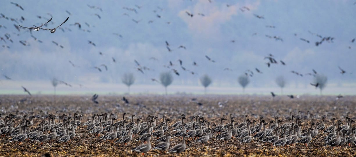 Wild geese descend on a field in the Oderbruch