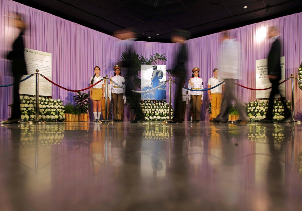 People react to a tribute to Cuba’s late President Fidel Castro inside the Jose Marti Memorial in Revolution Square