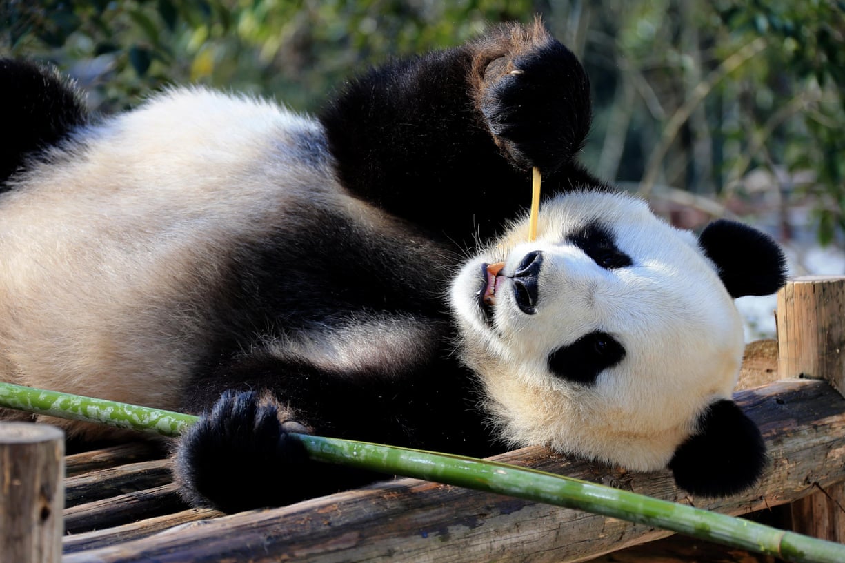 A relaxed giant panda chews bamboo in Xiuning Panda Park