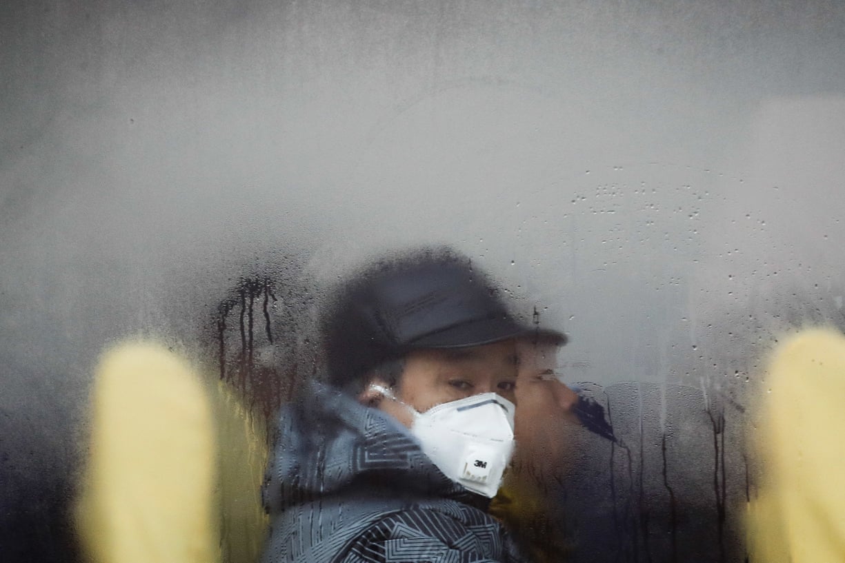 A man wearing a mask looks out from a bus in amid high levels of air pollution in the Chinese capital