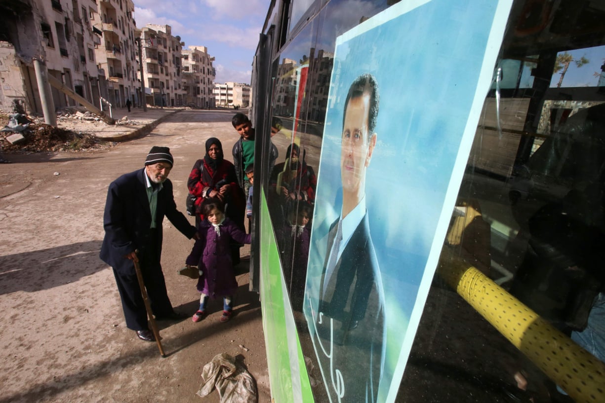 Syrians board a bus at the Razi bus stop in Aleppo’s Jamiliyeh neighbourhood for a trip through government-held territory between the two sides of the divided city