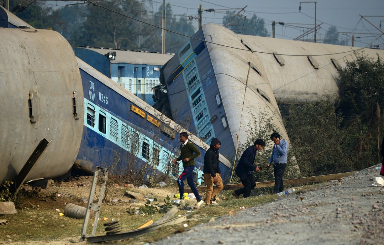 Officials and bystanders gather at the scene of a derailed train in Uttar Pradesh. At least two people died and 28 were injured in the accident