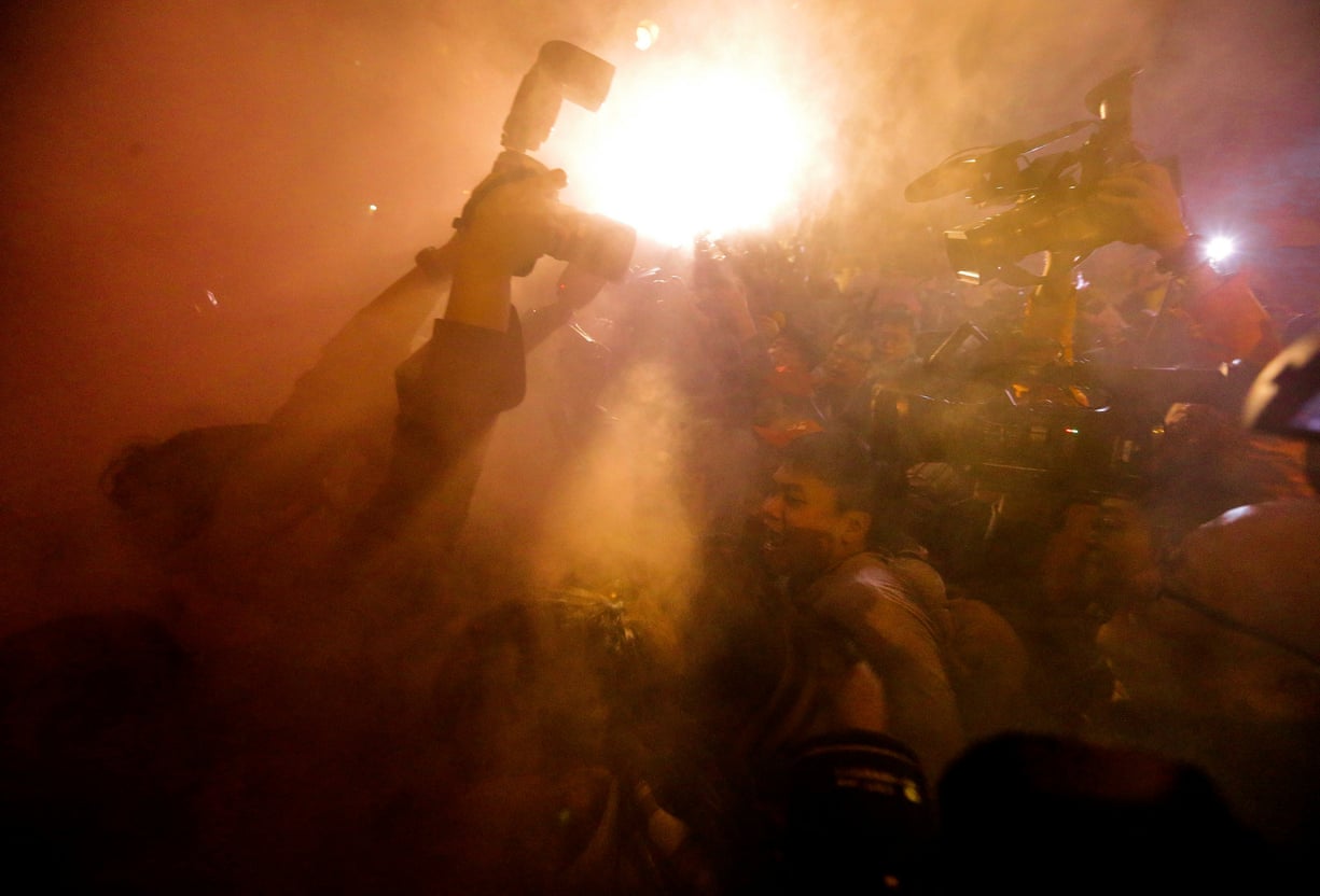 Protesters scuffle with police officers after throwing smoke flares outside parliament during a protest