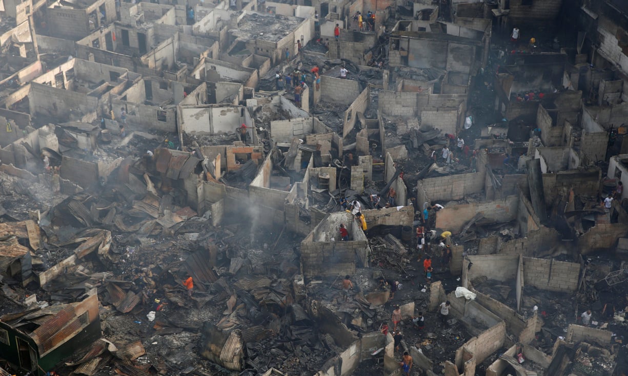 Residents sift through the ruins of their houses after a fire razed a squatter colony in Quezon city