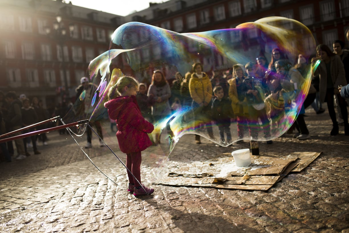 A child stands inside a large soap bubble made by a street artist