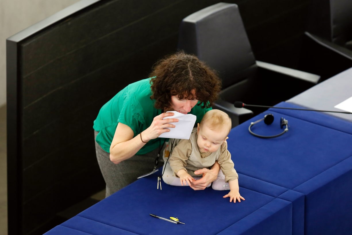 European Parliament member Anneliese Dodds (Britain, Labour Party) minds her baby during the election of a new president
