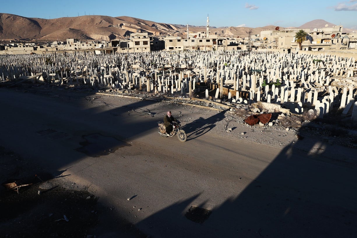 A man rides a motorbike past a cemetery in the rebel-held town on the eastern outskirts of Damascus
