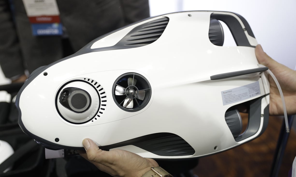 The PowerRay on Powervision booth during CES. The underwater drone will detect and take footage of fish, and can be controlled by VR goggles. Photograph: John Locher/AP