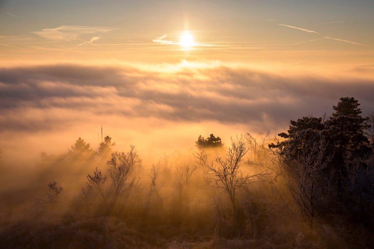The sun rises on a foggy day near the Guckler Károly Observatory