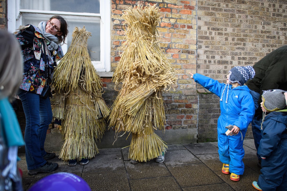 Two of the three Straw Bears pause during the annual Straw Bear Festival parade. The traditional event was revived in 1980 and features a Straw Bear and its children being led through the village near Peterborough. The bear dances, while musicians break off into groups around the village square to perform with Morris, Molly, Sword, Mummer and Appalachian dancing ‘sides’ or teams
