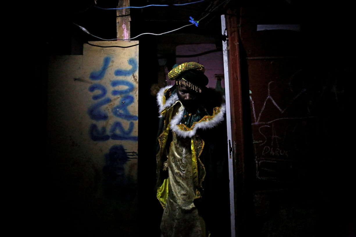 A volunteer at San Carlos Borromeo parish dressed as Balthazar, one of the Three Wise Men gives away gifts in the shanty town settlement of El Gallinero