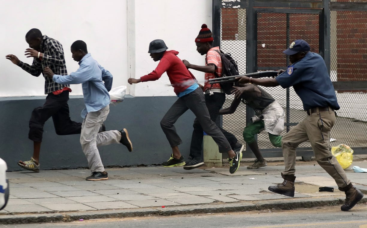 A metro police officer fires rubber bullets at anti-immigrant protesters in South Africa’s capital, while President Jacob Zuma condemned anti-foreigner violence and appealed for calm