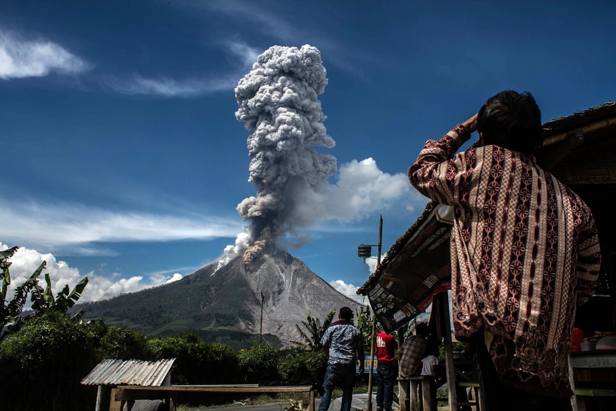 Mount Sinabung releases volcanic ash. At least seven people were killed when the volcano erupted last May